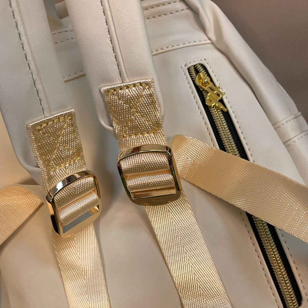 Es hat Metallreißverschlüsse und -zieher sowie eine Tasche mit vertikalem Öffnen auf der Rückseite, eine Innentasche, Taschen an den Seiten und eine taschenförmige Tasche auf der Vorderseite. Riemen mit Schnallen zur Größenanpassung: